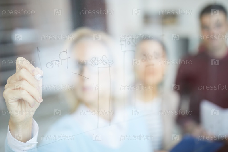 Близкий план сравнительной диаграммы рисунка леди на стеклянной доске во время анализа статистики вместе с командой