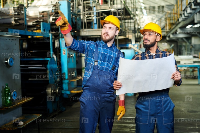 Серьезные мыслящие современные рабочие в униформе и шляпах смотрят на промышленную машину и обсуждают чертежи в фабричном магазине