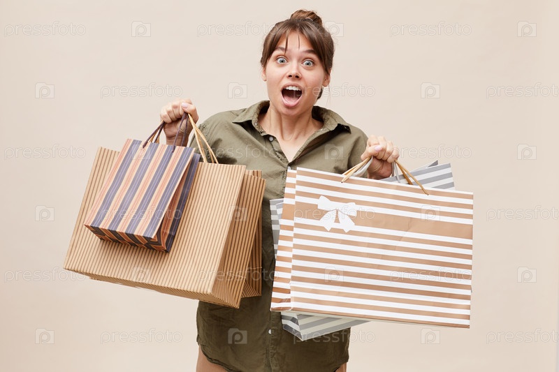 Портрет эмоциональной молодой женщины в непринужденной рубашке, которая сходит с ума от продажи в торговом центре и держит бумажные пакеты