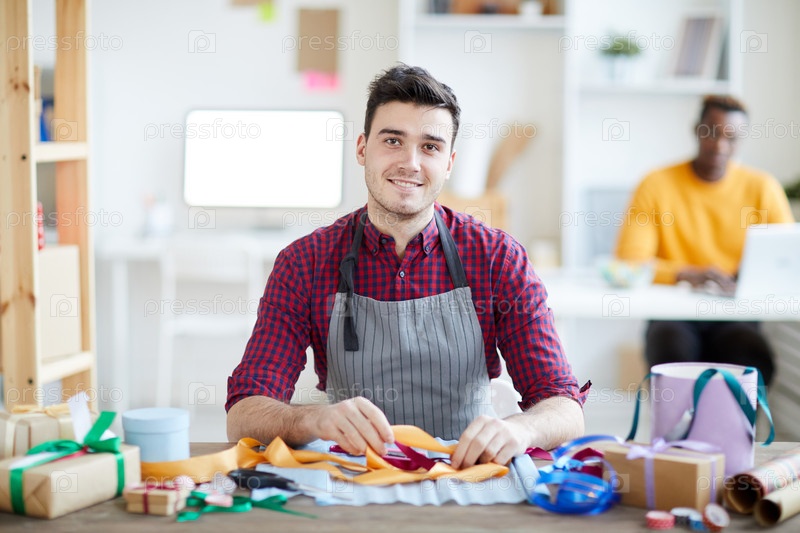 Content красивый молодой человек в фартуке сидит за столом и смотрит на камеру, работая в творческой мастерской