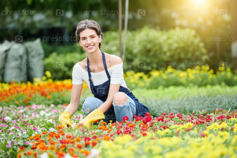 Красивая женщина, работающая с планами и цветами