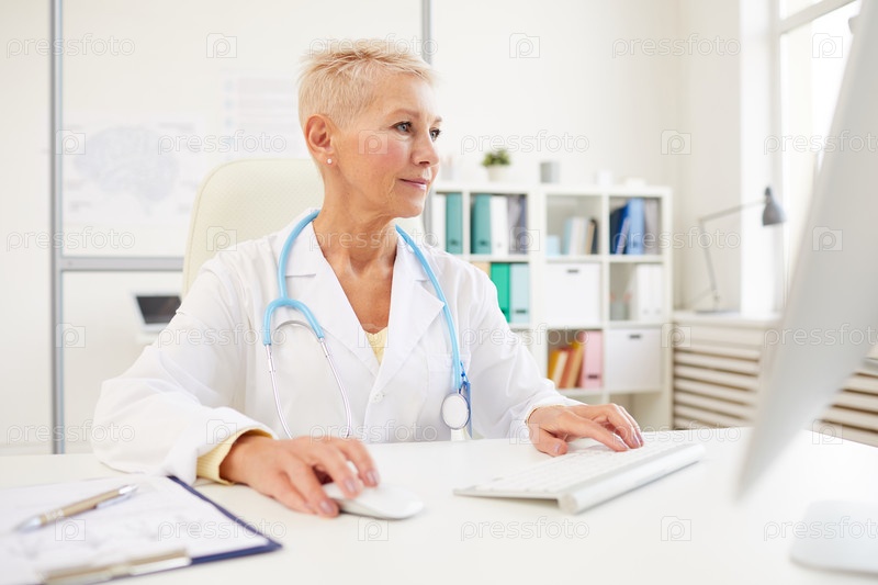Серьезно занятая зрелая женщина-врач в лабораторном пальто, сидящая за столом и использующая компьютер во время поиска медицинских исследований в Интернете