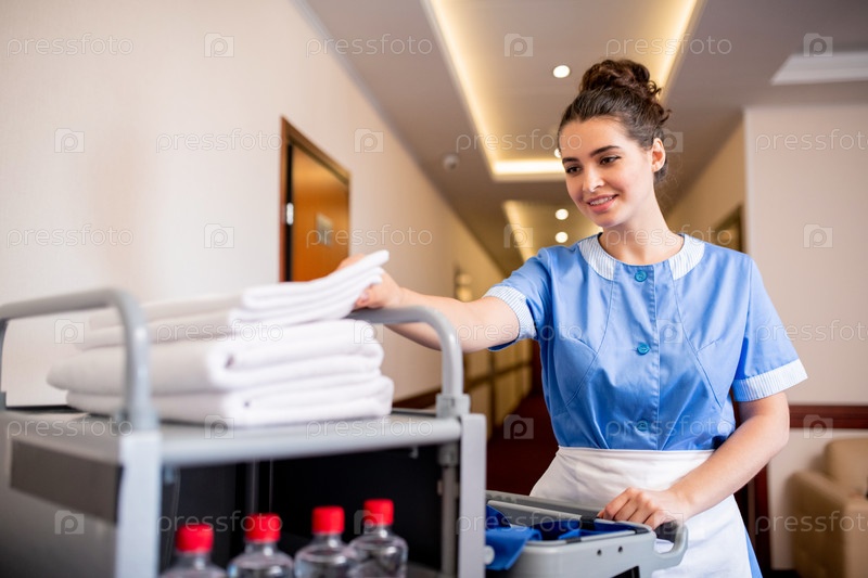 Молодая улыбающаяся горничная берет белый чистый полотенце с вершины стола