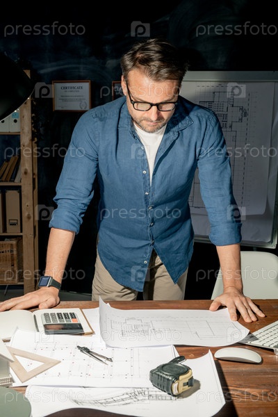 Зрелый инженер в повседневной одежде смотрит на эскиз на бумаге, работая сверхурочно