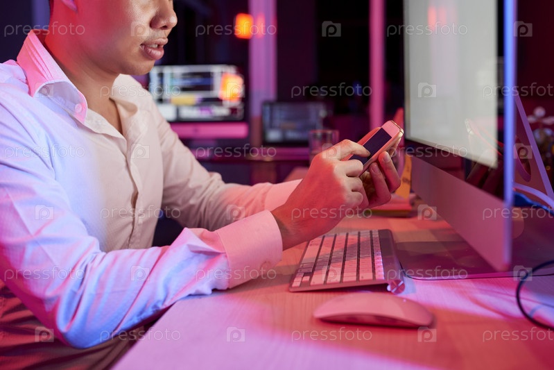 Офисный работник, использующий мобильный телефон в офисе