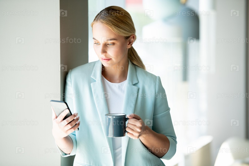 Молодая серьезная бизнесвуменка смотрит видео на смартфоне