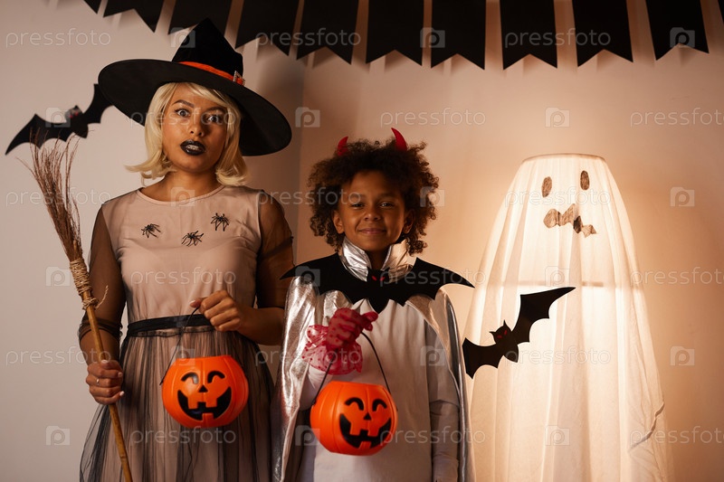 Мать и сын в комнате, украшенной для вечеринки Хэллоуина