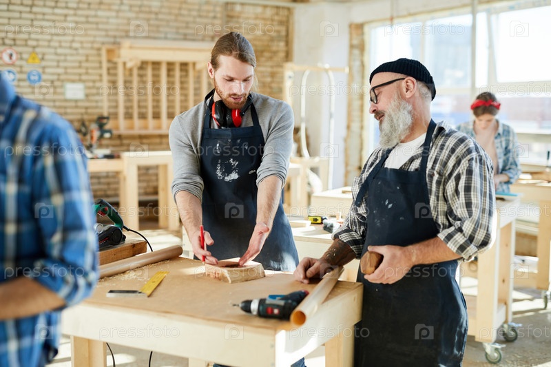 Курс столярного дела: уверенный квалифицированный старший учитель по плотницкому делу разговаривает с студентом-хипстером и отвечает на его вопрос в мастерской