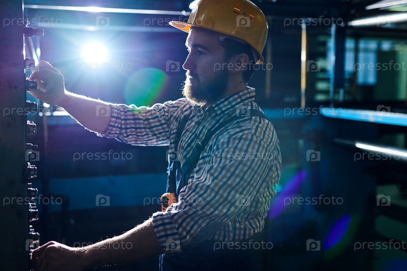 Серьезный занятый бородатый инженер в жесткой шляпе, стоящий у панели управления в темной мастерской и работающий на фабричной машине