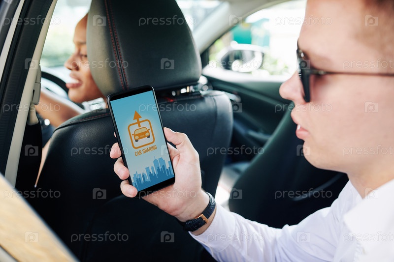Мужчина, использующий приложение для совместного использования автомобилей