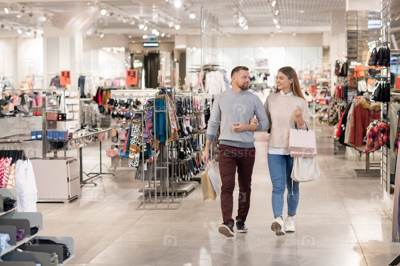 Счастливые молодые свидания, несущие бумажные пакеты во время передвижения вдоль отделения одежды