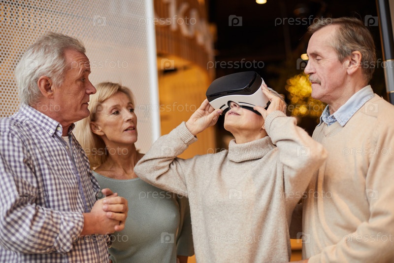Любопытная пожилая женщина в свитере смотрит наверх во время просмотра 3D-фильма в VR, ее друзья смотрят на её реакцию