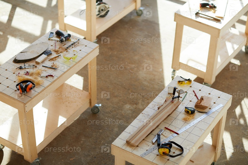 Никто в современной столярной мастерской с необработанными деталями и измерительным инструментом на колесных столах