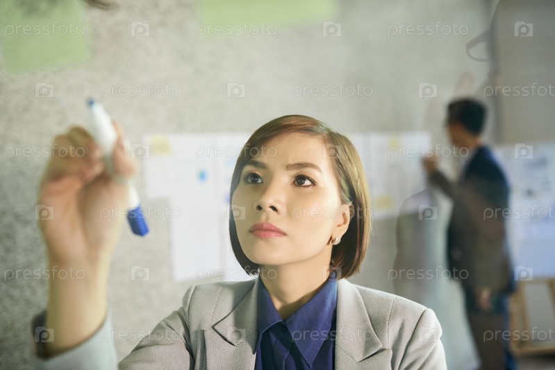 Деловая женщина пишет на стеклянной стене