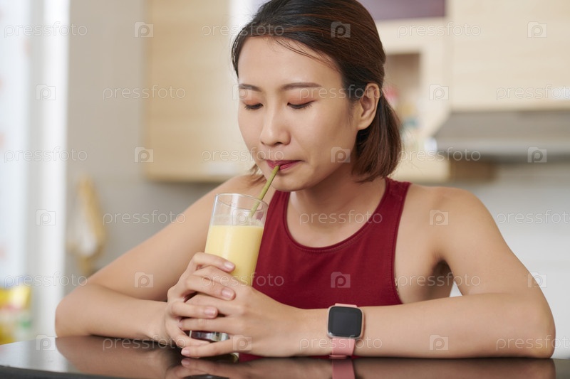 Вьетнамская женщина глотает фруктовый коктейль