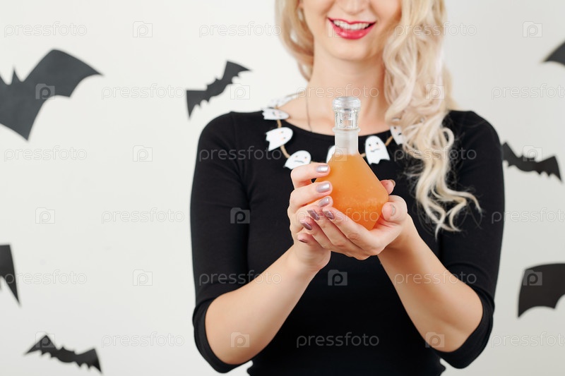 Улыбающаяся ведьма держит ядовитое зелье