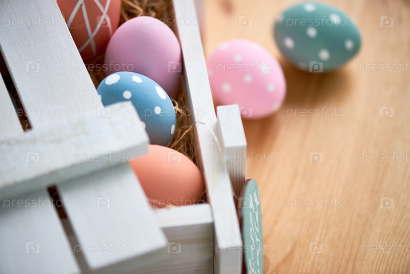 Близкий план открытой деревянной коробки с окрашенными яйцами в сена на обеденном столе