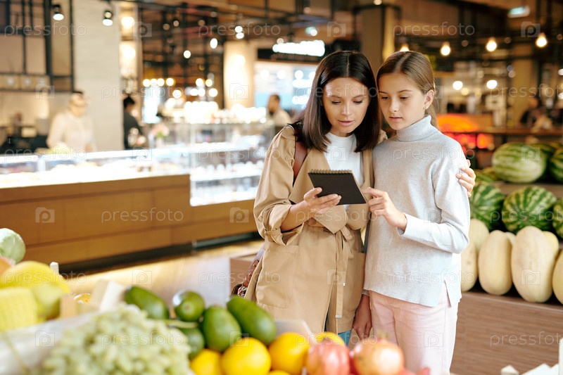Влюбленная молодая женщина и ее дочь читают список покупок в блокноте