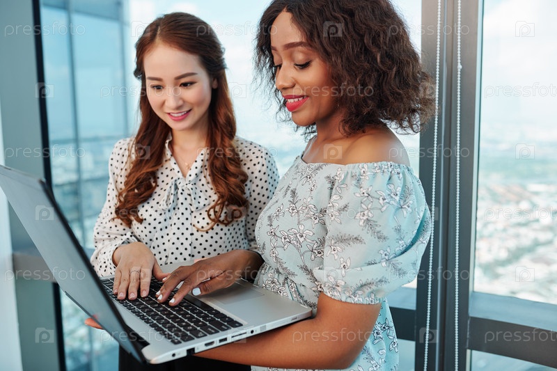 Женские менеджеры обсуждают статью на ноутбуке
