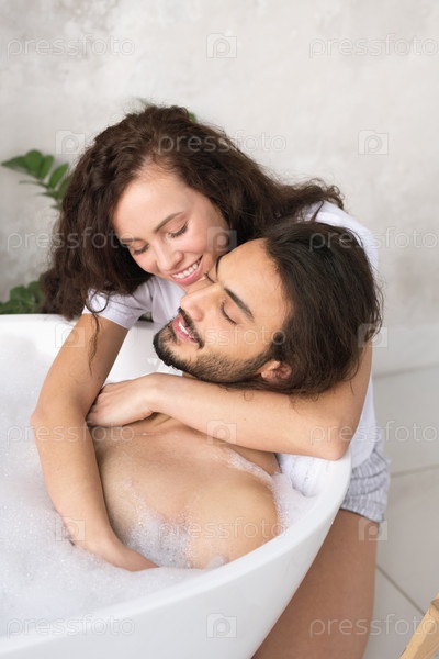 Счастливая молодая ласковая женщина обнимает своего расслабленного мужа, наслаждаясь ванной