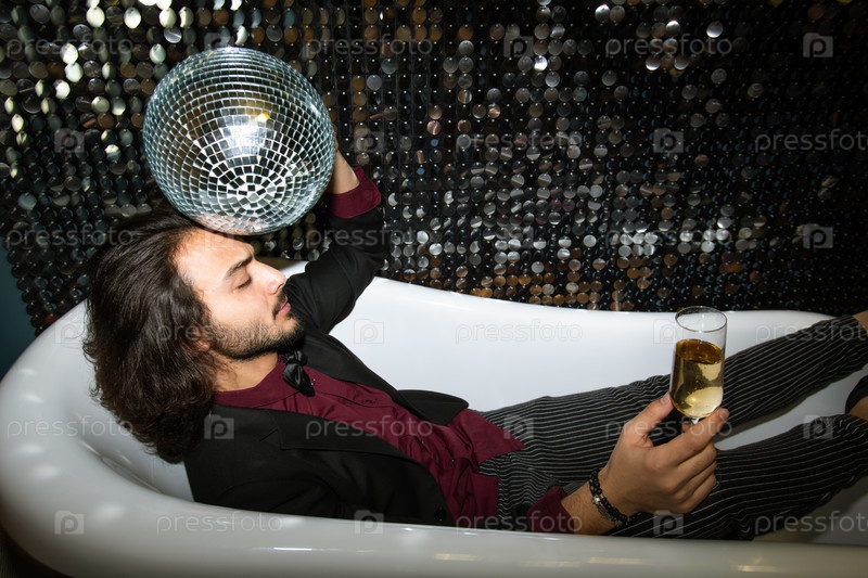 Усталый мужчина с дискотечным мячом за голову и флейтой шампанского отдыхает в ванной