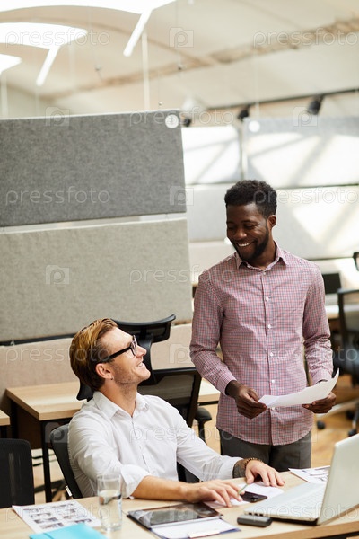 Веселые, креативные молодые мультиэтнические мужчины работают в команде и выбирают дизайн для цифрового проекта