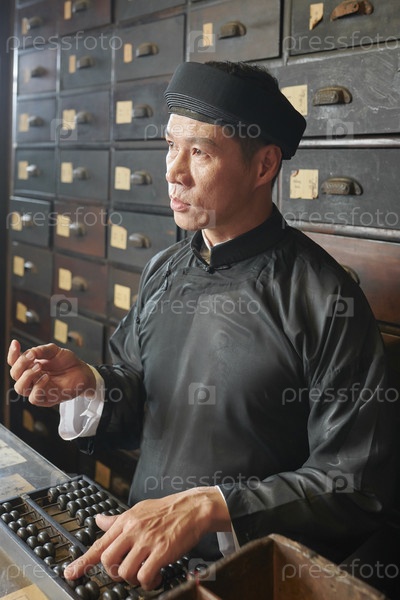 Работник аптеки, использующий абакус