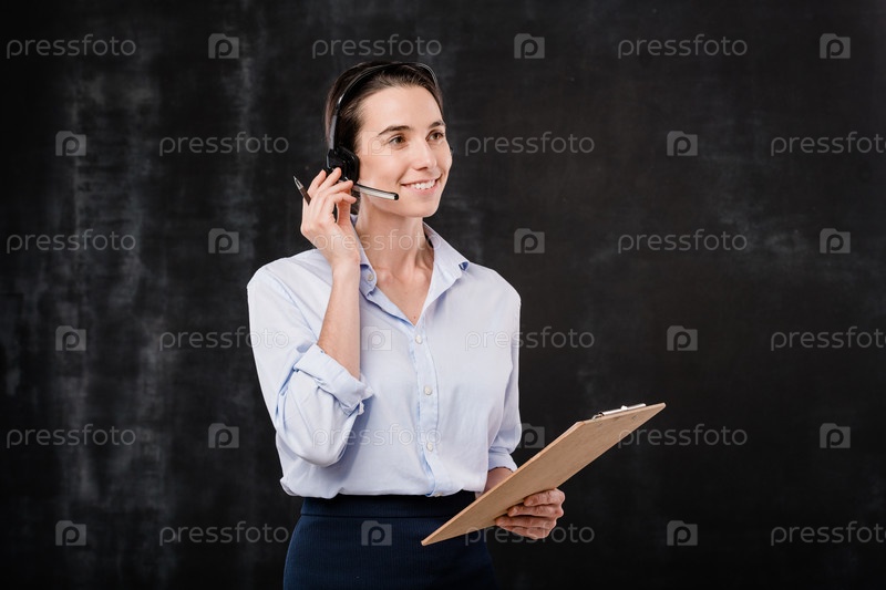 Веселая молодая женщина-оператор с буклетной доской, разговаривающая с клиентами в микрофоне