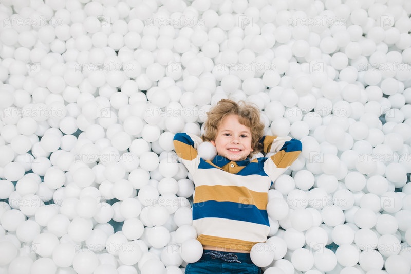 Очаровательный веселый мальчик, лежащий среди белых воздушных шаров и развлекающийся