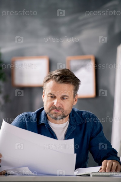 Бородатый архитектор средних лет в повседневной одежде смотрит на чертеж с эскизом