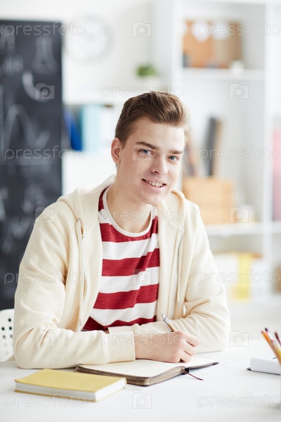 Улыбающийся красивый молодой студент-мужчина в капюшоне сидит за столом и делает записи в дневнике, глядя на камеру