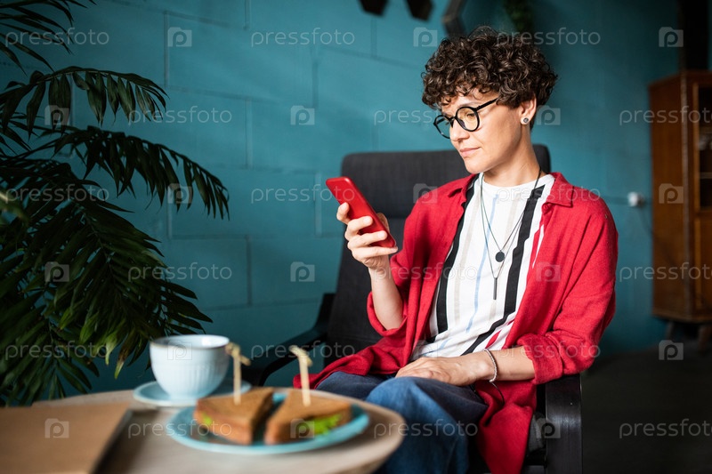 Молодая брюнетка-женщина со смартфоном, просматривающая социальные сети в кафе