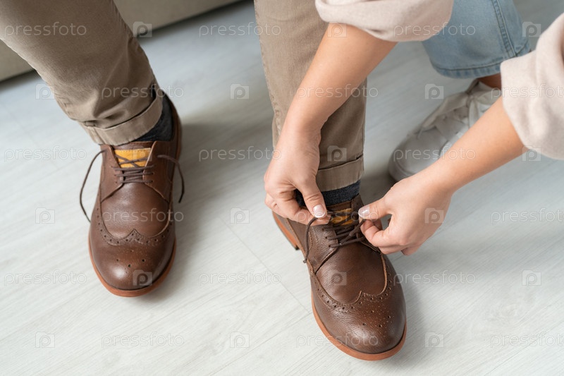 Руки осторожной дочери помогают старшему больному отцу с шнурками на сапогах