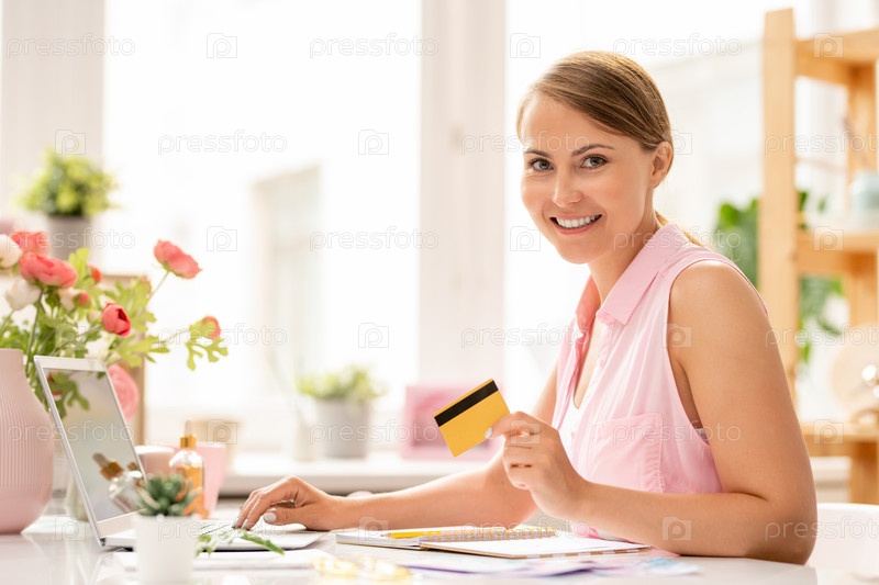 Счастливая молодая привлекательная женщина с пластиковой картой, делающая онлайн-заказ