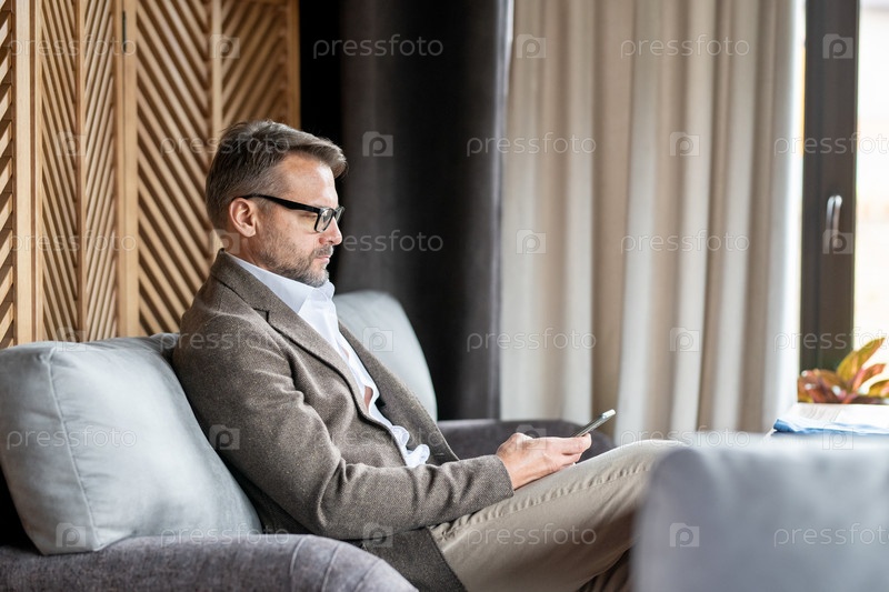 Серьезный мужчина сидит на диване в роскошном ресторане и прокручивает смартфон
