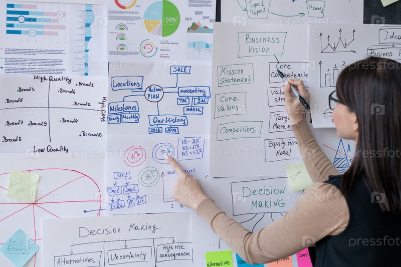 Молодой финансовый аналитик указывает на бумаги с диаграммами на доске