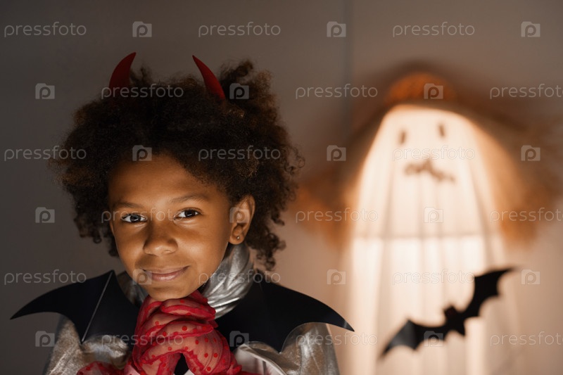 Мечтательный афроамериканский мальчик в платье на Хэллоуин
