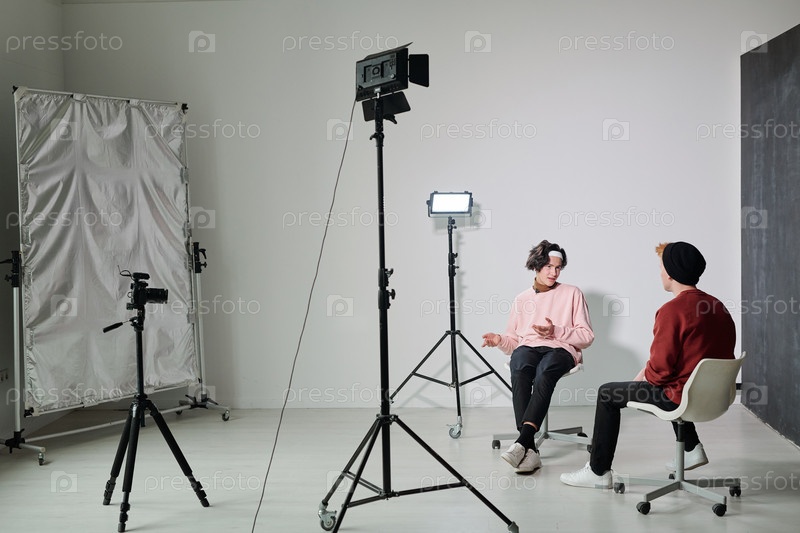 Один из двух молодых мужчин-влогеров объясняет что-то своему другу в студии