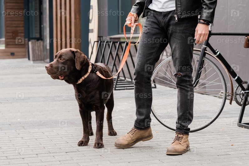 Милая чистокровная собака на поводке и ее хозяин в повседневной одежде, стоящий на тротуаре