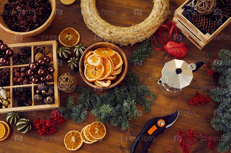 Высокоугольный вид красивых игрушек и веток сосны для изготовления рождественских венков, размещенных на деревянном столе с секаторами и кофемашиной