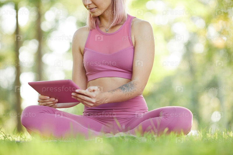 Спортивная женщина, использующая планшетный компьютер