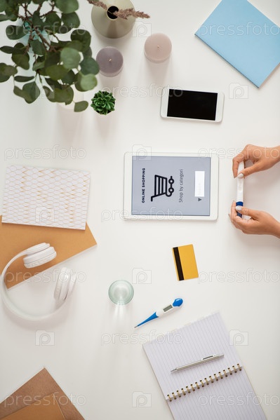 Женские руки с тестом на беременность и сенсорная панель с корзиной и строкой поиска