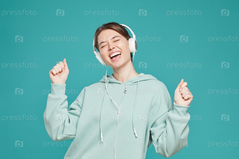 Экстатическая красивая девушка в наушниках и хипстерской толстовке стоит на зеленом фоне и танцует с закрытыми глазами