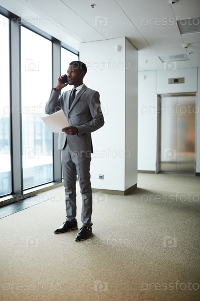 Чернокожий бизнесмен разговаривает по телефону в офисе