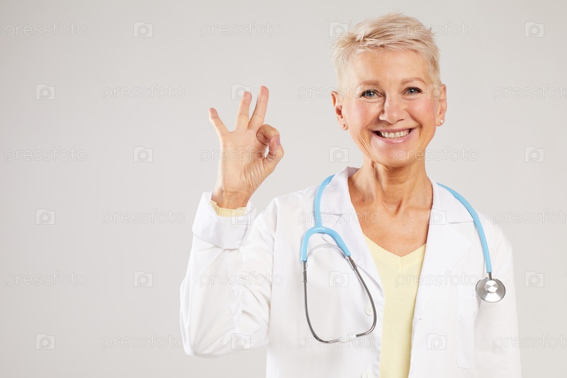 Портрет позитивной женщины-специалиста медицинского центра со стетоскопом на шее, стоящей на белом фоне и показывающей знак OK