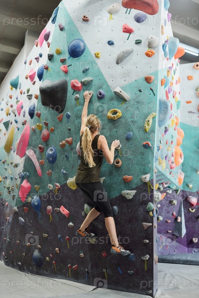 Молодая активная женщина с длинными волосами хватается за искусственные камни на скалолазной стене