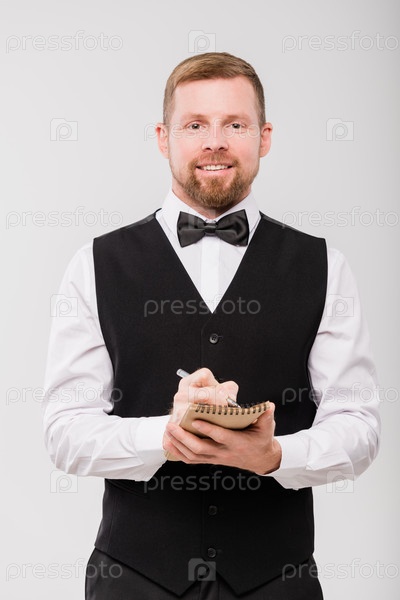 Счастливый молодой официант в галстуке и черном жилете записывает заказ клиента