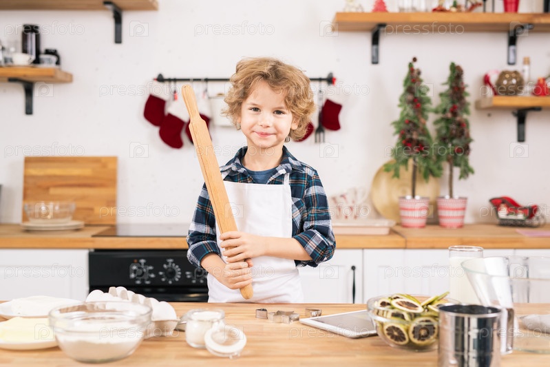 Счастливый маленький мальчик в фартуке, держащий роллинг-пин во время приготовления печенья