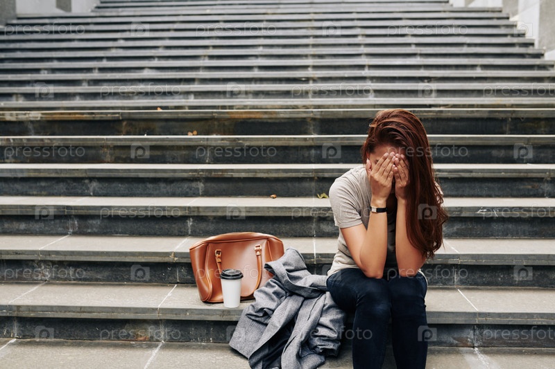 Плачущая женщина сидит на ступеньках
