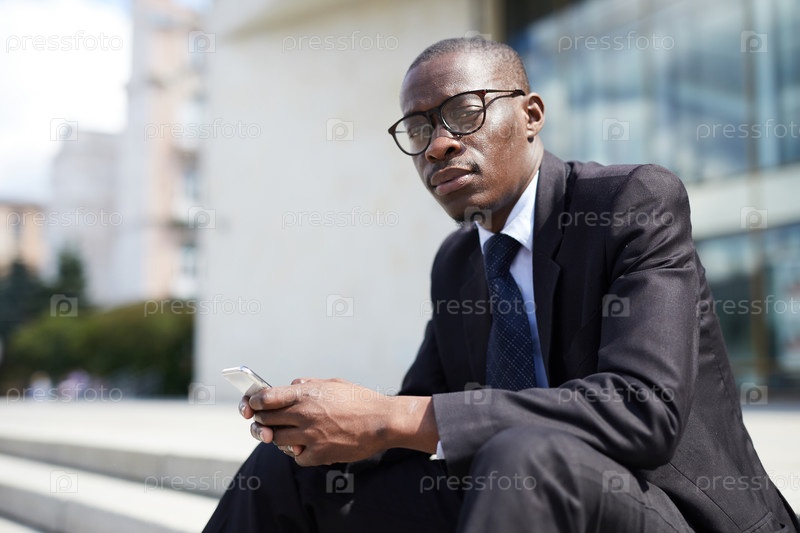 Афроамериканский бизнесмен, сидящий на лестнице